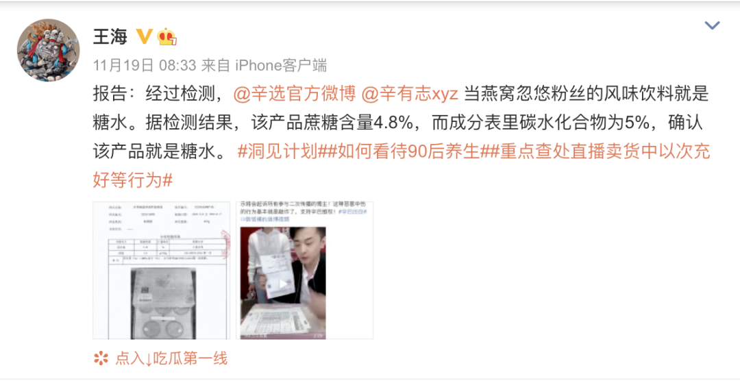 2020年11月19日,知名打假人士王海通过微博曝光,声称经过专业检测,辛巴在直播间售卖的所谓燕窝实际上是一种风味饮料,主要成分是糖水。