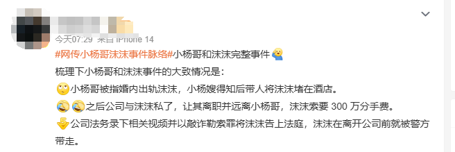 有网友在微博上发文称:“小杨哥被指婚内出轨沫沫,小杨嫂得知后带人将沫沫堵在酒店。之后公司与沫沫私了,让其离职并远离小杨哥,沫沫索要 300万分手费,公司法务录下相关视频并以敲诈勒索罪将沫沫告上法庭,沫沫在离开公司前就被警方带走。”