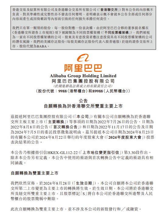8月28日,阿里巴巴集团发布公告,阿里巴巴正式完成香港双重主要上市,成为在港交所和纽交所双重主要上市的公司。