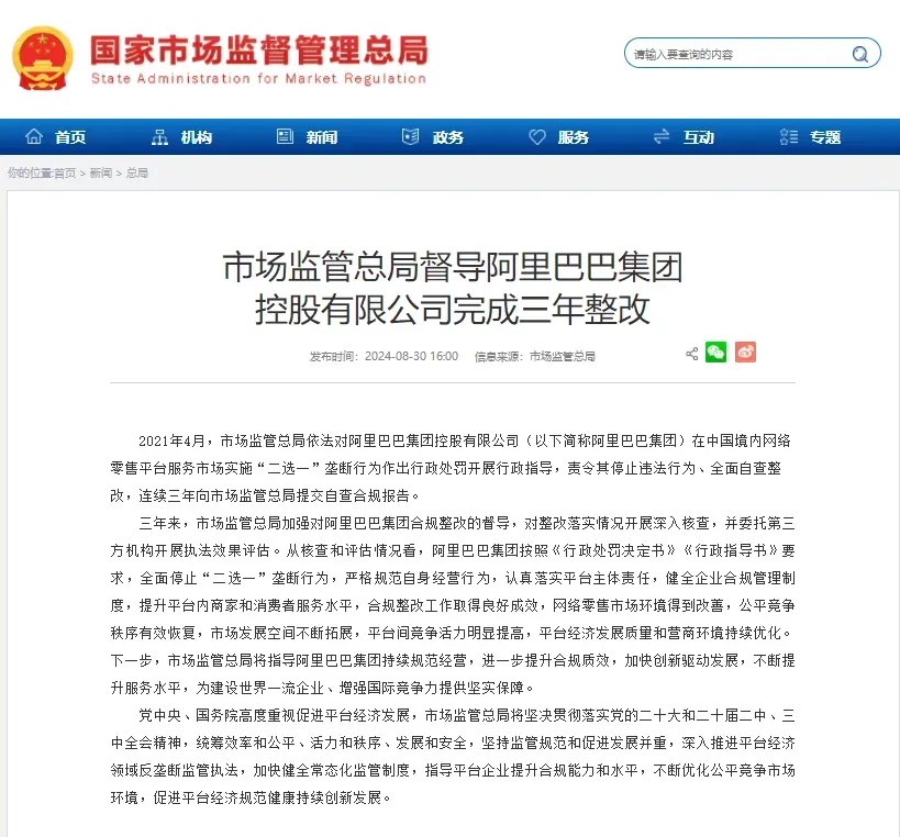 今年8月30日,国家市场监督管理总局发布公告称:市场监督管理总局督导阿里巴巴集团完成三年整改;阿里巴巴已按照要求,全面停止“二选一”垄断行为。