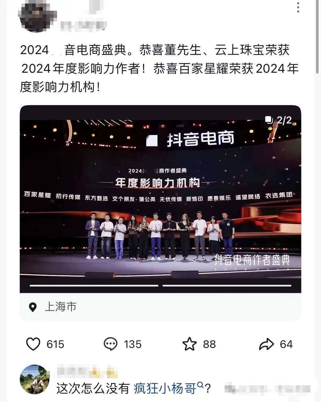与此同时,曾连续两年在抖音电商作者盛典中获奖的小杨哥,此次却未上榜,引发外界无限猜测。