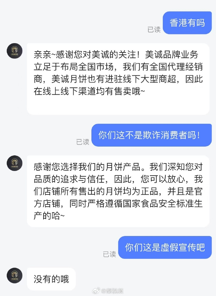 对于小杨哥曾在视频中介绍美诚月饼香港有卖的情况,客服并未正面回应,而是表示有全国代理经销商并进驻线下大型商超,线上线下渠道均有售卖,没有虚假宣传。