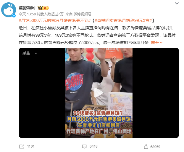 昨天(9月12日),蓝鲸新闻报道称,小杨哥及其旗下各大主播直播间均有在售一款名为香港美诚品牌的月饼,在香港却买不到,也没有门店。