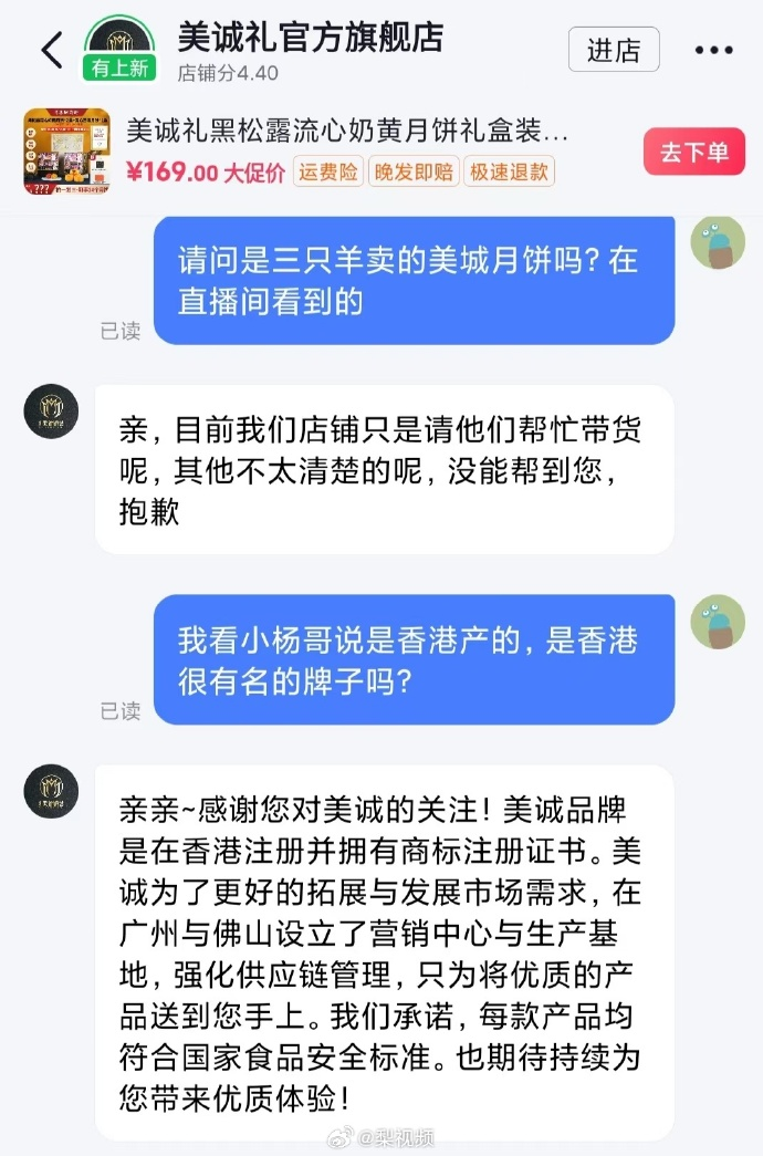 然而,小杨哥曾在直播中称,“香港美诚月饼”是高端品牌,香港也有得卖;月饼已经卖了两年,100多万单。