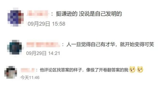 一些网友称:“挺谦逊的 没说是自己发明的”、“人一旦觉得自己有才华,就开始变得可笑”、“他评论区找答案的样子,像极了开卷翻答案的我”。