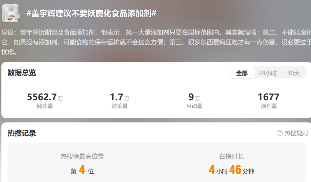 其先是因为在直播中称“不要妖魔化食品添加剂”,引发热议,登上热搜。