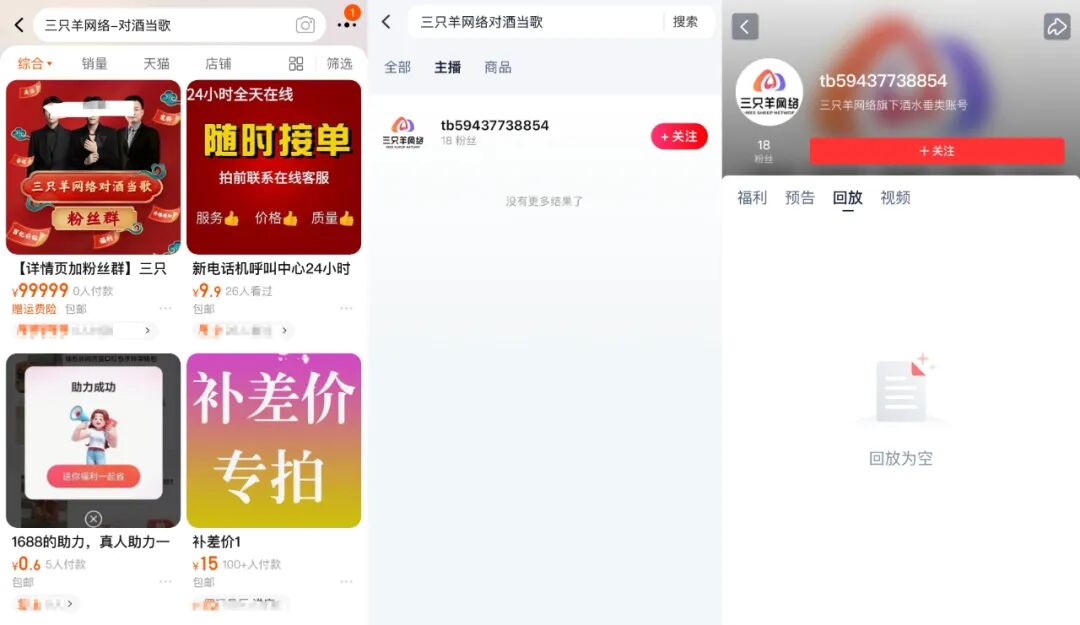 随后,电商天下进淘宝直播搜索“三只羊网络对酒当歌”,结果出来了一个用“三只羊网络”logo做头像、用英文+数字命名的账号,点进去则发现,该账号只有18个粉丝,“回放”一栏显示为空。