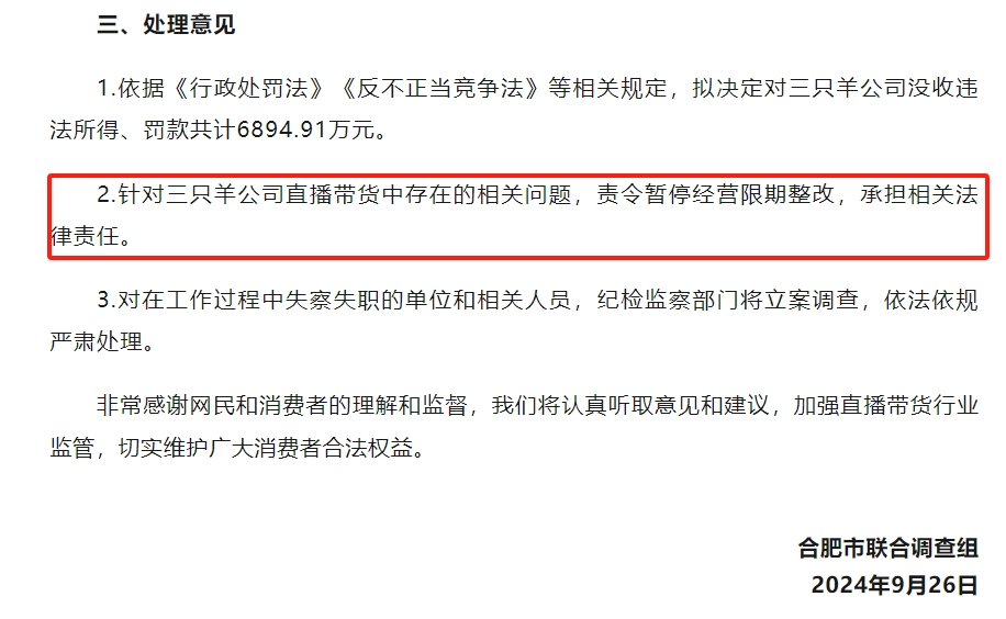 因为在9月26日合肥官方的处罚意见中,曾明确规定:责令其(三只羊)暂停经营限期整改并承担相关法律责任。