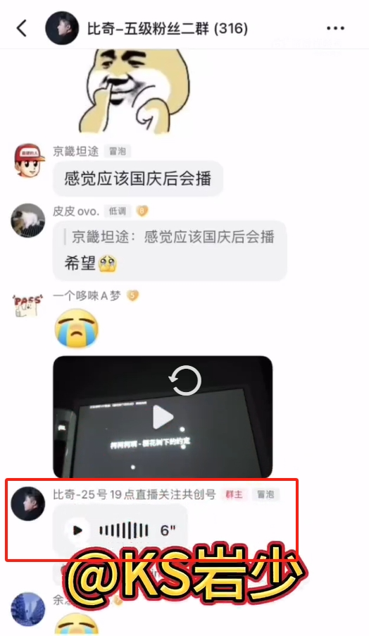 9月29日,有微博网友发文称:小杨哥用艺人“比奇”的账号在粉丝群里发语音祝粉丝国庆节快乐,天天开心。