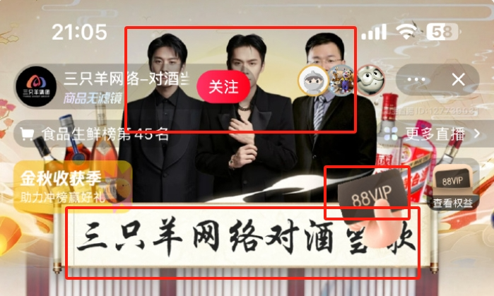 从细节来看,这个直播间顶部出现了大小杨哥、卢文庆三人的肖像图片,账号头像也出现了“三只羊集团”的字样与logo,同时旁边还有“88VIP”等挂件。
