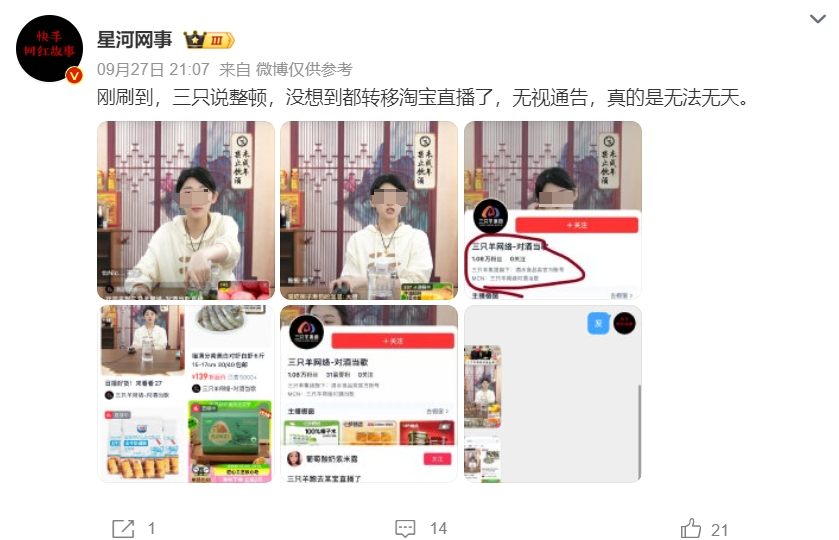 9月27日深夜,网友@星河往事发布微博表示:刚刷到,三只(羊)说整顿,没想到都转移淘宝直播了,无视通告,真的是无法无天。