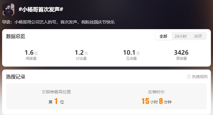 因此,该消息爆出后,#小杨哥首次发声#话题火速霸榜热搜,共计有1.6亿人次围观。