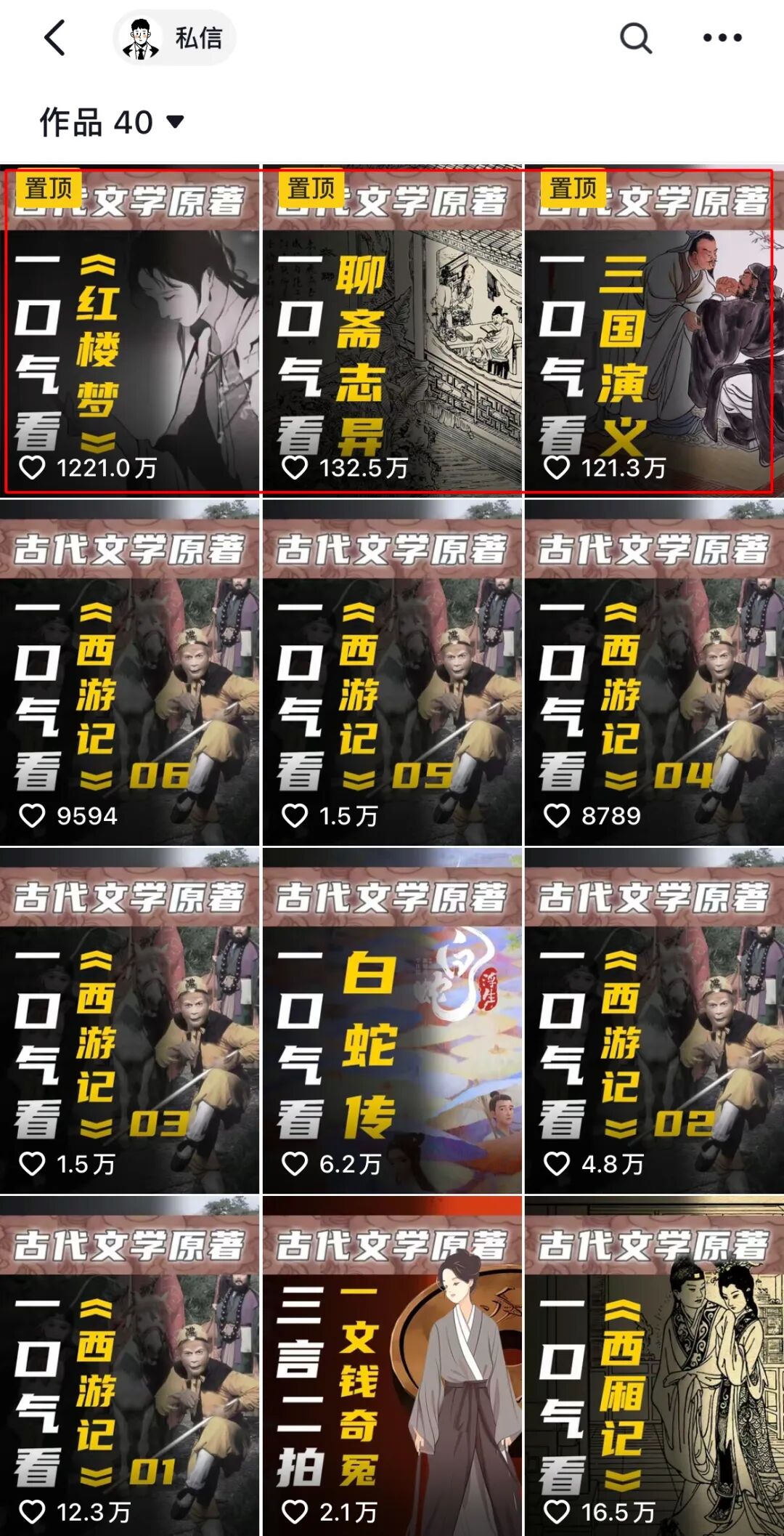 爆火之后,作者一鼓作气,连续发布了“一口气看完《西厢记》”、“一口气看完《西游记》”、“一口气看完《三国演义》”等多个作品。