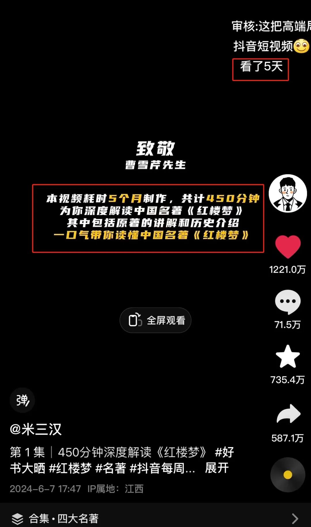 6月7日,一位 IP显示在江西的博主@米三汉,发布了一条新作品,标题内容为“ 一口气看完《红楼梦》”的视频。
