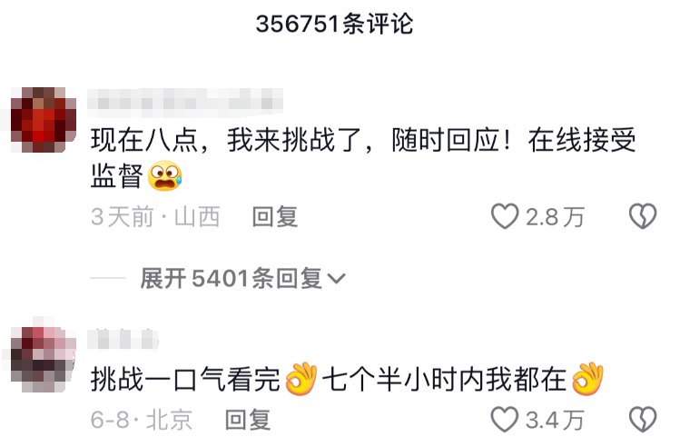 有一些网友直接在视频下的评论区发起“一口气看完的挑战“,全国各地网友用这种方式实现赛博狂欢。
