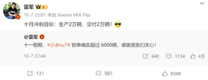 而如今的小米汽车,在雷军的积极宣传下,市场反应也颇为不俗,据雷军10月7日发布的微博称,仅十一假期,小米su7的销售额就超过了6000辆。