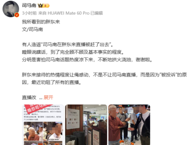 直播被叫停赶走,丢了面子的司马南紧急发文,澄清自己被“劝离”是胖东来的无差别对待,还补充:直播改为录播,在店里拍摄了6个多小时,走之前还有胖东来员工在门口围着合影哩。
