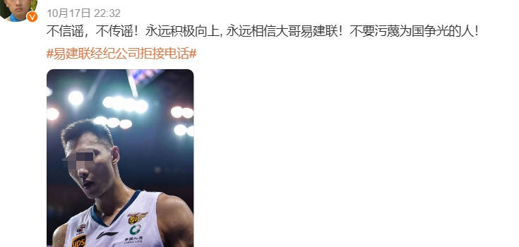 紧接着,媒体又联系上易建联所属的经纪公司——北京众辉国际体育管理有限公司,但急着多次拨打该公司的多个电话,均被挂断或无人接听。此外,记者发送询问短信,也未收到回复。