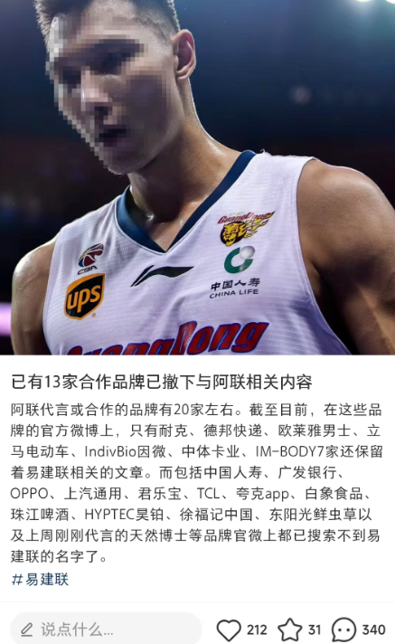 与广大网友的冷静不同,不少与易建联有合作的品牌、企业,选择主动避嫌。