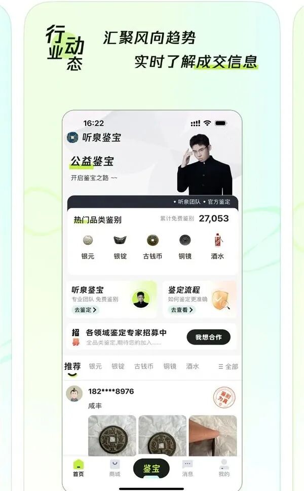 此外,该APP主要提供鉴宝、回收和交易等服务,品类则包括银元、银锭、古钱币、铜镜、服装、鞋类、奢包等。
