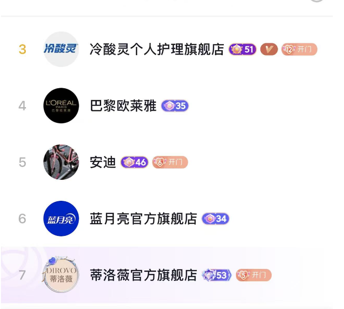开播仅仅几分钟,冷酸灵、欧莱雅、蓝月亮、蒂洛薇、七度空间等品牌就以刷礼物、霸占打赏榜单的方式,刷了一大波存在感。