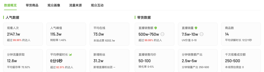 飞瓜数据显示,听泉首次直播带货销售额的为750万元,观看人次超过2000万!