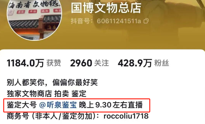 过去,听泉鉴宝直播时多次提到,如果连麦网友想交易文物,可以找“郭博文”,即其关联小号“国博文物总店”。