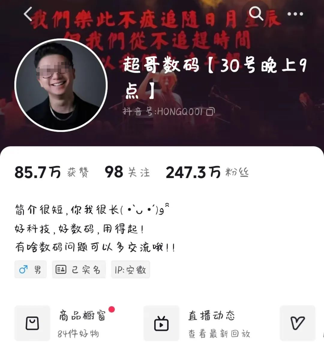 昨晚,三只羊旗下主播“超哥数码”宣布9点复播。但经过观察,其账号IP尽管让显示为安徽,但关于三只羊的MCN标识已被删除。同时,其账号中与小杨哥相关的视频也一并被全部删除。目前“超哥数码”在抖音上拥有247.3万粉丝。