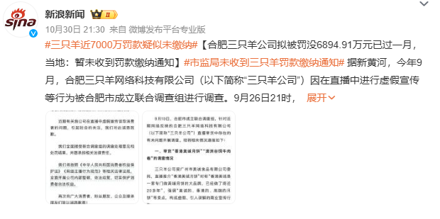 昨天(10月30日),有媒体就三只羊罚款缴纳进度向安徽合肥市场监督管理局办公室询问,得到的答复是:“我们最近也接到过咨询此事的电话,这边通知的是有相关问题可以拨打综合规划处的电话了解情况。”
