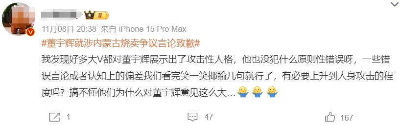 而董宇辉本人,则在随后的一场直播中虚心认错,直言“没有恶意,主要是因为自己见识短浅”。
