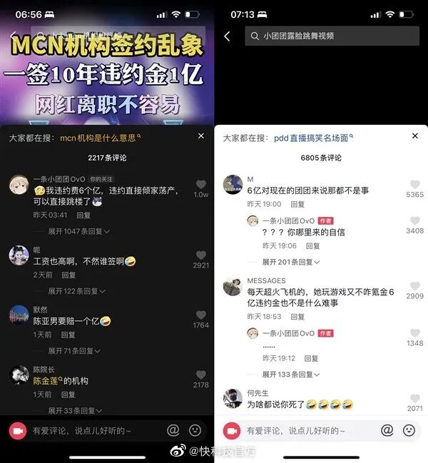 2021年,4000万粉丝的“一条小团团”一度停播,并解释称要去处理“工会合同问题”;后来她在评论区自爆,“我违约金六个亿,违约直接倾家荡产,可以直接跳楼了”。