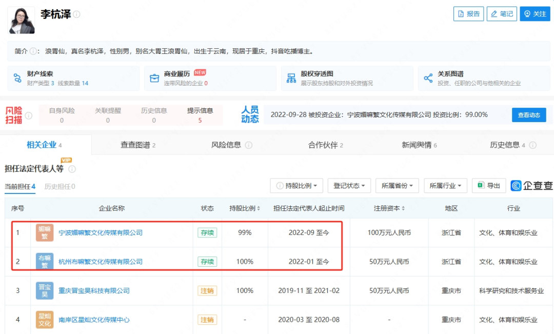 还是以浪胃仙李杭泽为例,企查查显示,其名下关联有4家公司,其中有两家已注销,而存续的两家企业均为2022年之后注册。