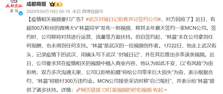 2020年4月,因武汉日记爆火的“林晨同学”,火了后便遭到背后MCN的机构“压榨”;双方矛盾公开后,林晨被告知不按要求拍摄商业广告就算违约,需赔偿300万违约金。