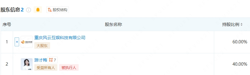 据企查查信息显示,游某某目前仍拥有重庆天权星40%的股份!