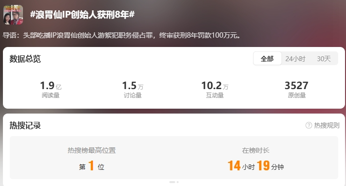 头部吃播网红IP“浪胃仙”创始人游絮,因犯职务侵占罪,终审获刑8年、罚款100万元。