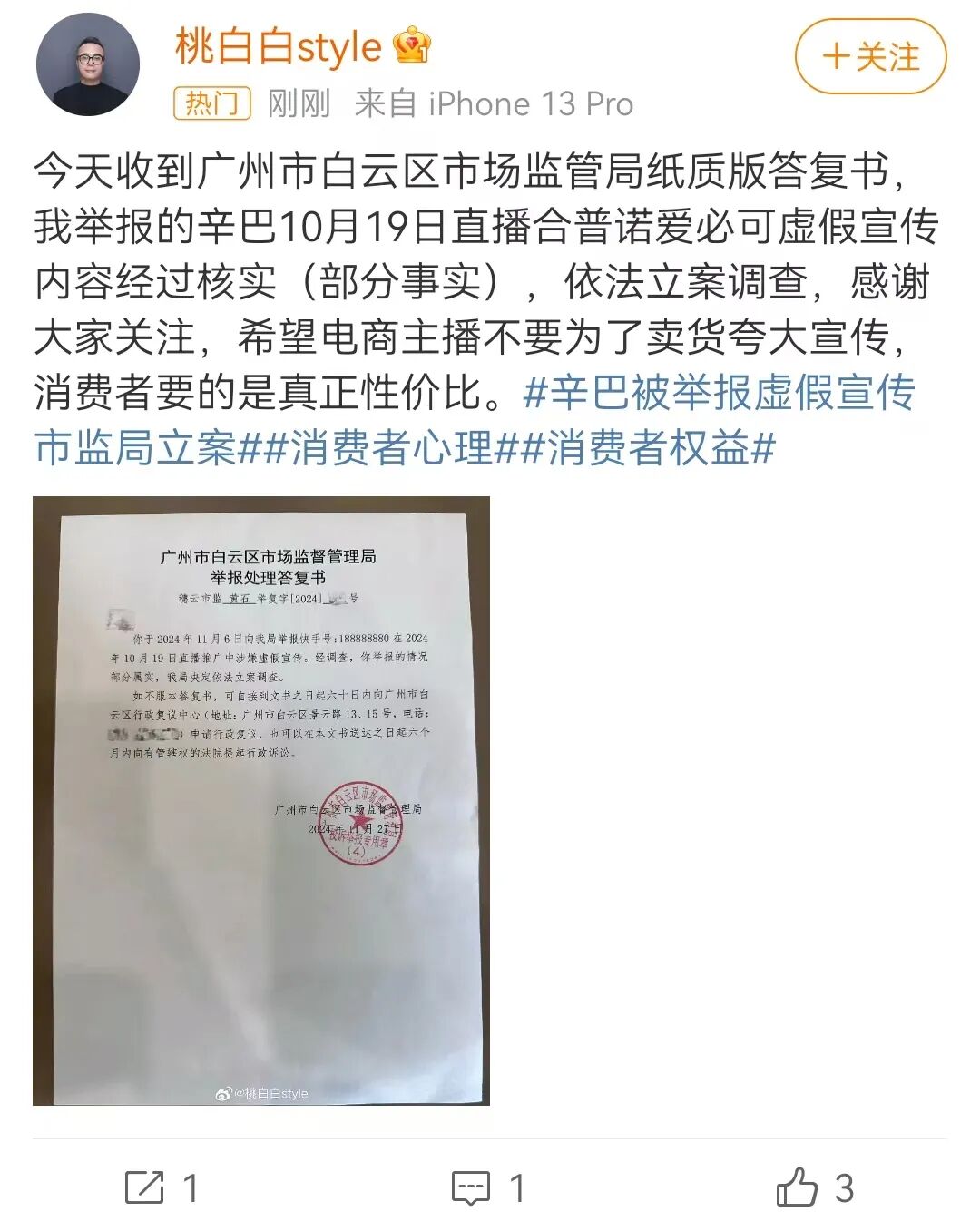 11月29日,此前曾举报辛巴直播带货的@桃白白style,对外称:已收到广州市白云区市场监督管理局的答复书。