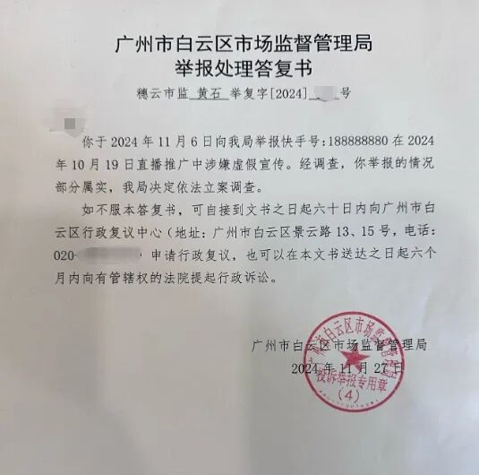 彼时,广州市白云区市监局的答复内容便赫然注明:我局决定于2024年11月25日依法立案调查。