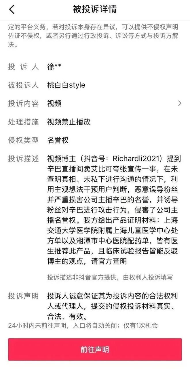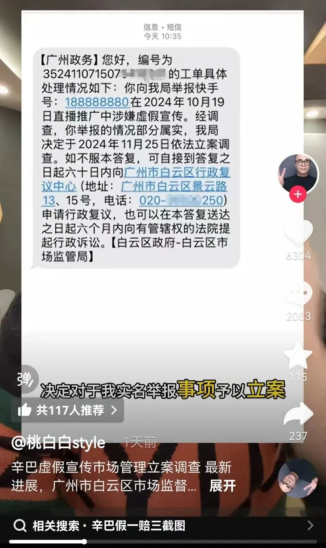 随后,喊话无果的桃白白转而向广州市白云区市监局实名举报辛巴虚假宣传。直到现在,官方开始介入调查。