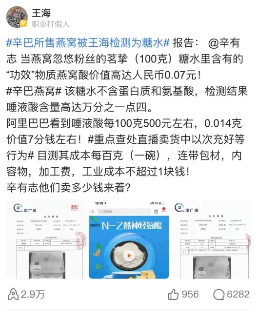 2020年11月,知名打假人王海爆料称,辛巴直播间带货的一款“小金碗碗装燕窝冰糖即食燕窝”成分存在问题,并晒出该款燕窝的检测报告:蔗糖含量4.8%,碳水化合物为5%,确认该产品就是糖水。