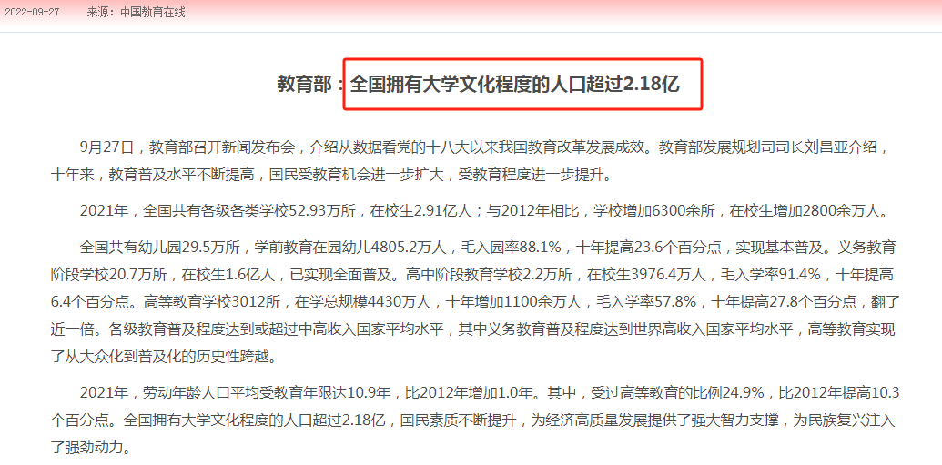 据我国教育部官方数据显示,在2022年,全国拥有大学文化程度的人口超过2.18亿。