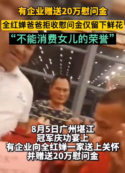 彼时,面对带着20万“慰问金”与鲜花前来祝贺的某企业,全红婵父亲一度明确表示:我不能消费女儿的荣誉。
