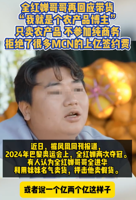 全进华明确表示过,全红婵只是妹妹,不是赚钱的工具,因此也从不会故意利用全红婵的消息去博取关注,只是在努力靠自己进行直播、带货农产品。