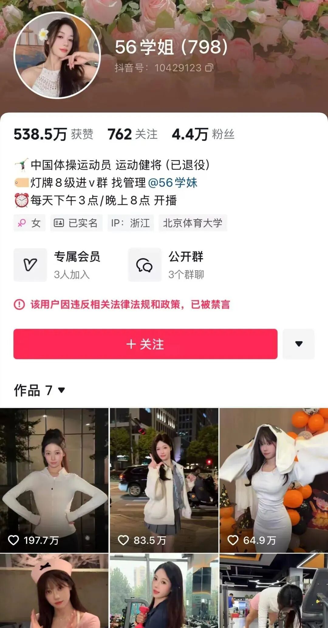 要知道,直到昨晚,吴柳芳的抖音账号都还有631万粉丝,而目前,吴柳芳抖音账号仅剩余4.4万粉丝,主页也已经明确显示出了“该用户因违反相关法律法规和政策,已被禁言”的字样。