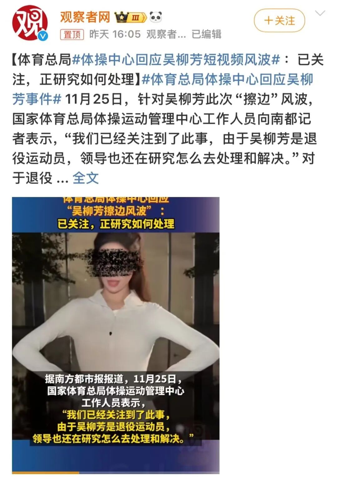 11月25日,国家体育总局体操运动管理中心工作人员向媒体表示,已经关注到了吴柳芳的擦边风波,由于吴柳芳是退役运动员,领导也还在研究如何处理和解决。