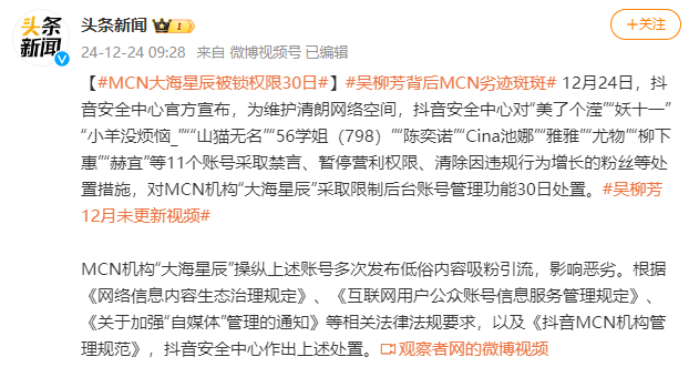 在上文提及的公告中明确指出,除了对以吴柳芳为首的一众博主实施封禁之外,抖音还“对MCN机构‘大海星辰’采取限制后台账号管理功能30日处置”。