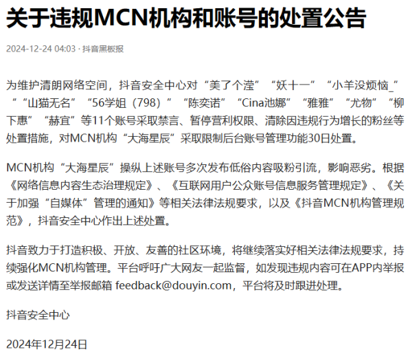 在抖音安全中心发布的公告中指出:MCN机构“大海星辰”操纵上述账号多次发布低俗内容吸粉引流,影响恶劣。