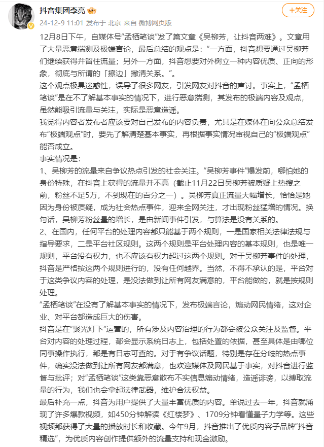 12月9日上午,抖音副总裁李亮在个人社交媒体平台发布长文,明确回应吴柳芳事件,他表示:吴柳芳粉丝量的增长是由新闻事件引发,与算法并无关系。