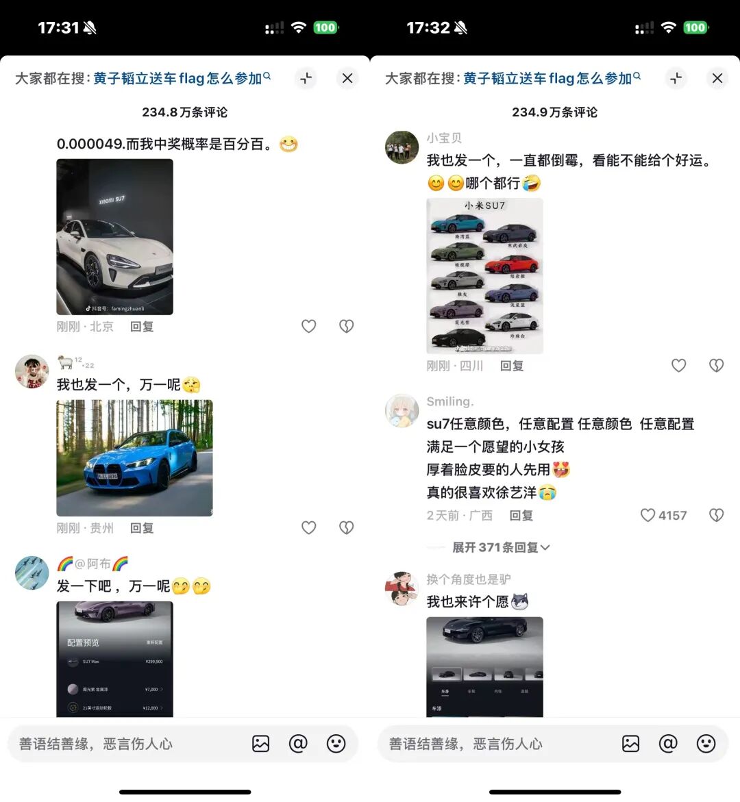 同样火爆的还有黄子韬最新视频作品的评论区,截至12月26日下午,评论区的留言已经达到234万,勇当“分母”参与抽奖的网友们将评论区变成了车型的许愿池,在池子里,小米su7成为了炙手可热的“爆款”。
