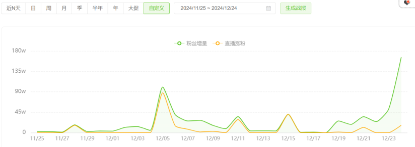 据蓝鲸新闻报道,飞瓜数据显示,近一个月内,黄子韬涨粉超700万,而关键的两个涨粉节点分别是12月5日与12月24日单日涨粉超百万。