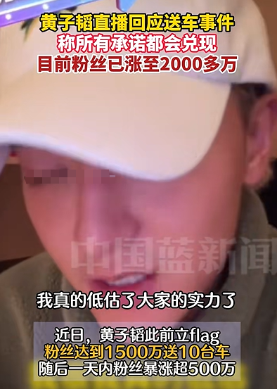 近日,“黄子韬一日涨粉500万”的话题登顶了微博热搜榜,起因是他在12月24日的直播中承诺:只要粉丝超过1500万,就抽奖送出10台国产汽车。